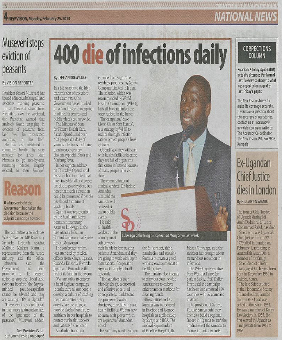 2015.03.08 【ウガンダの衛生環境とは?①】 ウガンダでは、「ミレニアム開発目標(Millennium Development Goals: MDGs)」の中でも「乳幼児死亡率の削減」と「妊産婦の健康状態の改善」の2項目について、その目標達成が危ぶまれています。ウガンダの5歳児未満の死亡率は1,000人中99人、また、妊産婦死亡率は、10万出生件中310人となっています。 乳幼児・妊産婦の死亡は、劣悪な衛生環境に起因する感染症も、その主要な原因の一つとなっています。 < 【病院の現場〜院内感染予防... 【ウガンダの衛生環境とは?②】 >
