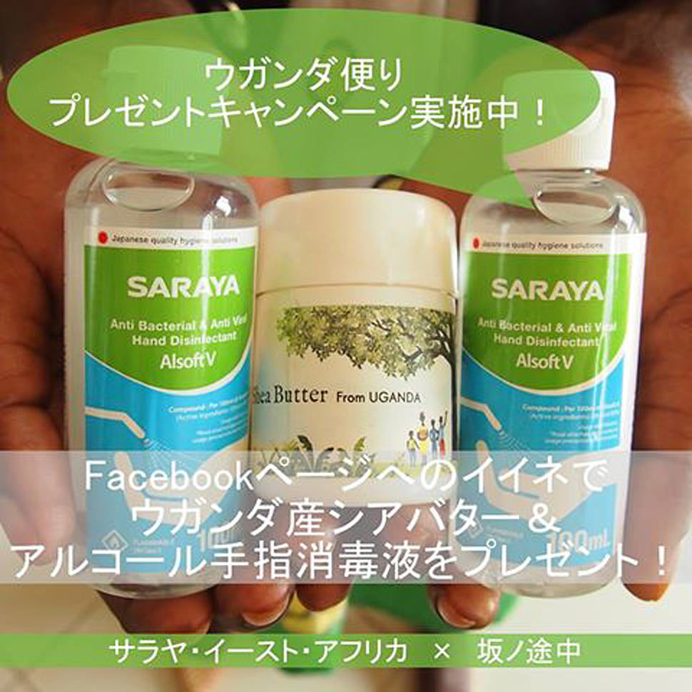 サラヤ・イースト・アフリカが生産しているアルコール手指消毒液と、株式会社 坂ノ途中が生産しているシアバターを包み、日本の皆様へ"ウガンダ便り"をお届けします。